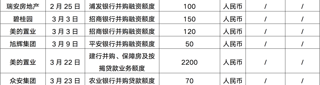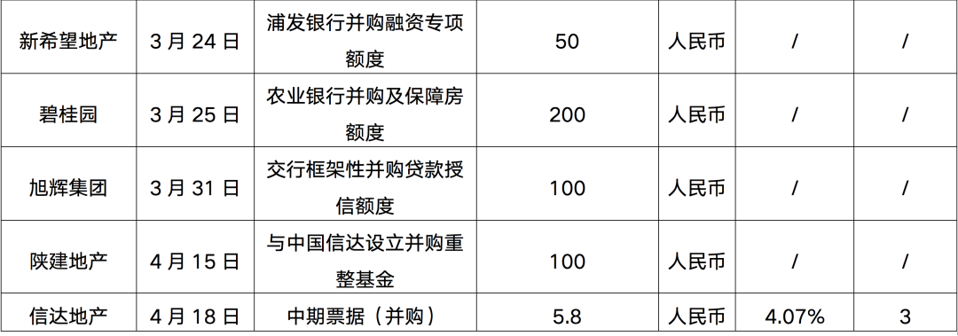 在此同時(shí),針對(duì)出險(xiǎn)企業(yè)的并購(gòu)融資,政策也給予了較大程度的支持,3月以來(lái)更多的房企與金融機(jī)構(gòu)建立了并購(gòu)融資協(xié)議,獲得并購(gòu)融資額度,除了華僑城、招商蛇口、建發(fā)房產(chǎn)、華潤(rùn)置地、大悅城等央企國(guó)企發(fā)行并購(gòu)中期票據(jù)成功或者獲批并購(gòu)融資額度之外,另有旭輝、五礦地產(chǎn)、碧桂園、美的置業(yè)、新希望地產(chǎn)等民營(yíng)企業(yè)并購(gòu)融資額度獲批。