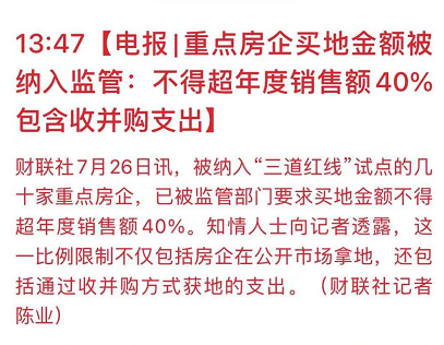 財(cái)聯(lián)社7月26日訊,被納入“三道紅線”試點(diǎn)的幾十家重點(diǎn)房企,已被監(jiān)管部門要求買地金額不得超年度銷售額40%。