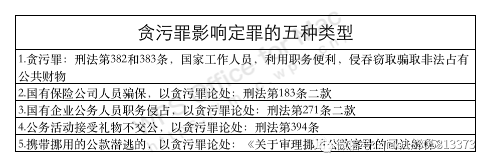 《刑法》382條和383條規(guī)定了貪污罪的表現(xiàn)形式處罰標準,另外,還有三個條文明確以貪污罪論處,包括第183條二款的國有保險公司人員騙保,第271條二款國企人員職務侵占,第394條公務活動接受禮物應交公而不交公。《關于審理挪用公款案件的司法解釋》規(guī)定了攜帶挪用公款潛逃的以貪污罪論處。