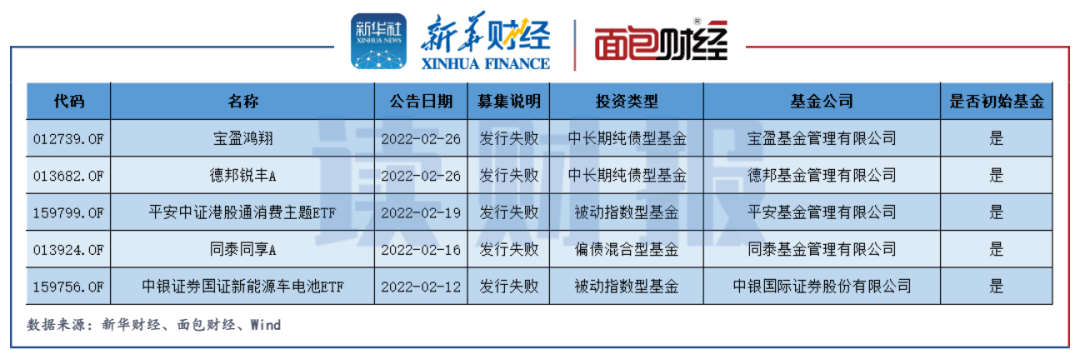 以公告日統計,2022年前兩個月累計已有5只公募基金產品發行失?。ǔ跏蓟鹂趶剑▽氂櫹琛⒌掳钿J豐A、平安中證港股通消費主題ETF、同泰同享A、中銀證券國證新能源車電池ETF。這5只產品中,2只屬于中長期純債型基金、2只屬于被動指數型基金、另外1只屬于偏債混合型基金。