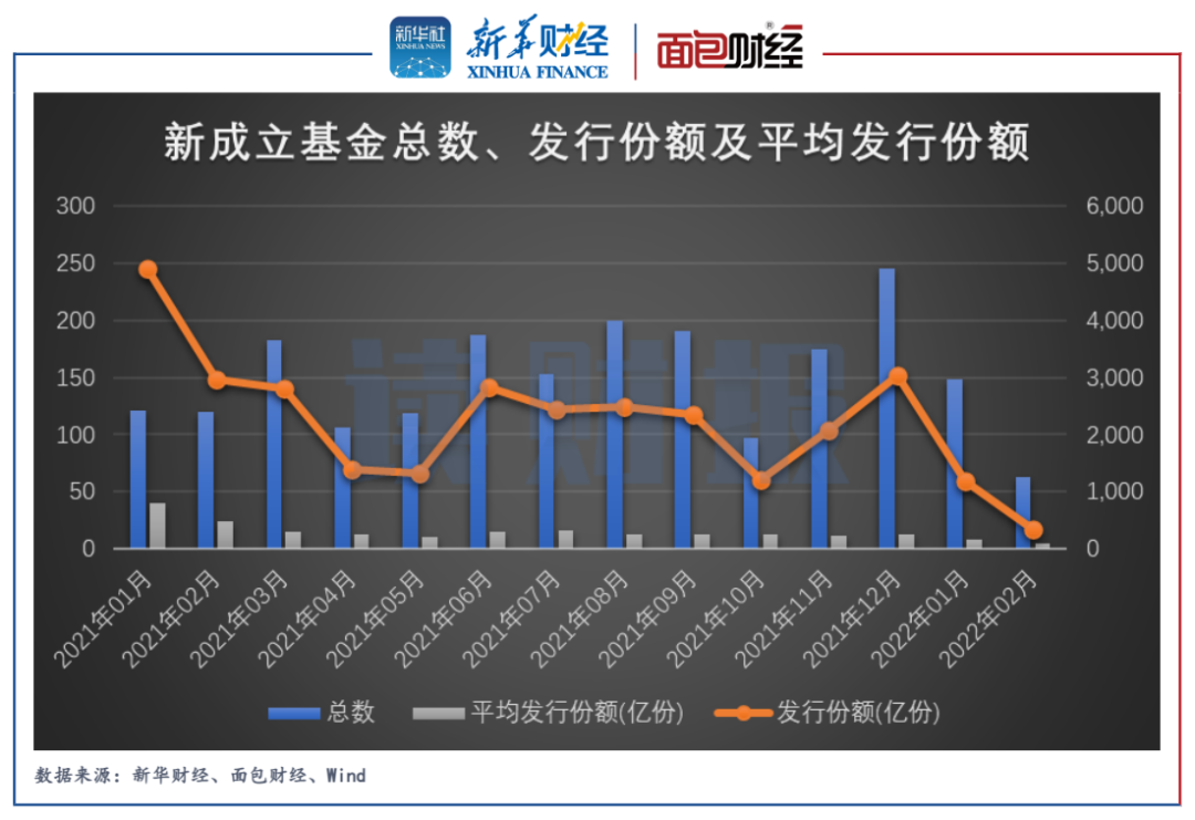 數據顯示,2022年2月共成立基金63只,發行份額為337.67億份,平均發行份額5.36億份,三個指標均創2021年以來單月新低。對比來看,2021年2月共成立基金120只、發行份額2966.80億份,平均發行份額為24.72億份。