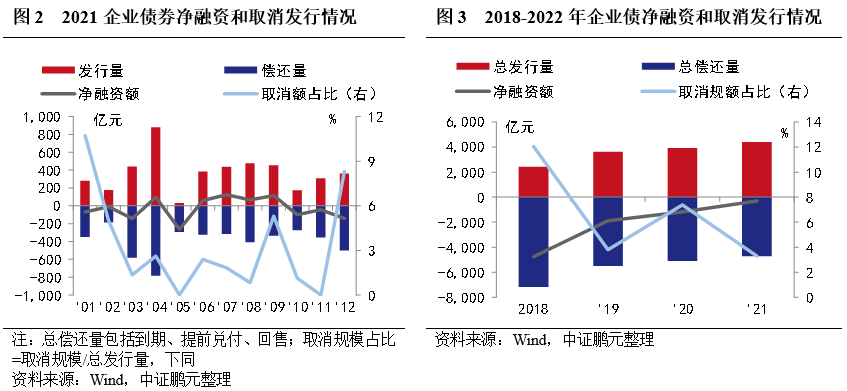 市場概況:(1)2021年企業(yè)債券發(fā)行491只,發(fā)行規(guī)模4,399.40億元,與上年同期相比分別上升27%和12%。(2)2021年企業(yè)債券總發(fā)行規(guī)模4,399.40億元,總償還規(guī)模4,707.55億元,凈融資-308.15億元,上年同期為-1,182.03億元。此外,2021年有23只企業(yè)債券取消發(fā)行,原計劃發(fā)行規(guī)模145.10億元,其中,有12只債券已擇期在年內(nèi)成功發(fā)行。