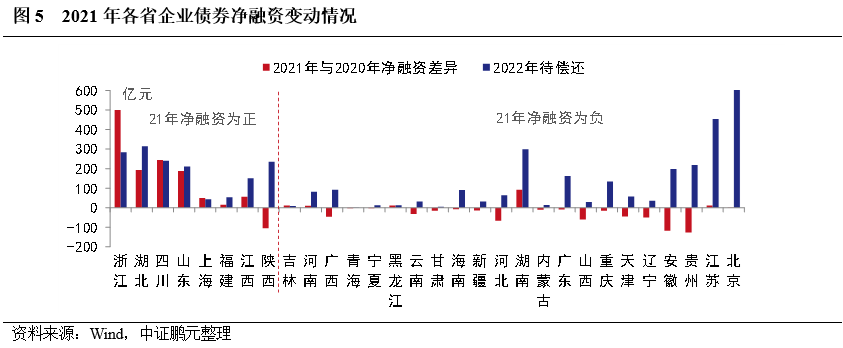 從地區(qū)分布看,2021年企業(yè)債凈融資依然呈現(xiàn)兩極分化,其中,8個省份凈融資為正,另有8個省份本年度尚未發(fā)行企業(yè)債。具體來看,浙江實現(xiàn)凈融資398.01億元,遠高于其他省份,其次是湖北和四川分別實現(xiàn)凈融資281.57億元和273.51億元,位居第二、第三。此外,上海因償還規(guī)模較小,實現(xiàn)凈融資規(guī)模99.87億元,位居第四。而江蘇因償還規(guī)模較大,凈融資規(guī)模為-184.87億元。青海、甘肅、黑龍江、海南、內(nèi)蒙古、山西、遼寧和西藏本年未發(fā)行企業(yè)債,其中遼寧省累計償還109.51億元,償還規(guī)模較大。與2020年相比,12個省份凈融資規(guī)模出現(xiàn)增長,18個省份出現(xiàn)下降,其中,浙江和四川凈融資規(guī)模明顯增長,貴州、安徽和陜西的凈融資較上年出現(xiàn)明顯下降。北京、江蘇、湖南、湖北等省份,2022年待償還企業(yè)債規(guī)模較大,需關(guān)注償還壓力較大,且2021年凈融資出現(xiàn)下滑的地區(qū)。