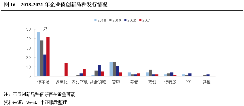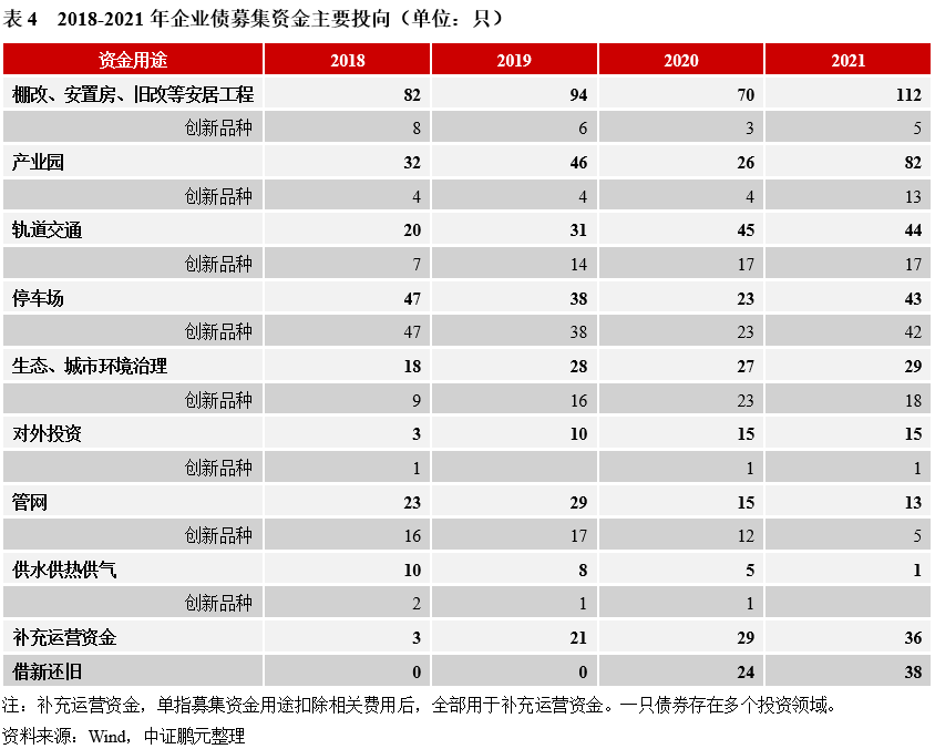 從募集資金用途看,棚改、安置房等安居工程是企業(yè)債的主要投向,占比23%左右,其次是產(chǎn)業(yè)園相關(guān)項目2021年出現(xiàn)明顯增加,數(shù)量占比17%,軌道交通和停車場項目占比也相對較高,各占9%。此外,2020年來,借新還舊和全額補充運營資金(扣除相關(guān)發(fā)行費用后)明顯增加。結(jié)合創(chuàng)新品種看,除停車場長期以發(fā)行專項債為主外,生態(tài)、城市環(huán)境治理領(lǐng)域發(fā)行創(chuàng)新品種的占比也較高,主要為綠色債,軌道交通和管網(wǎng)領(lǐng)域創(chuàng)新品種也較多,其他領(lǐng)域中創(chuàng)新品種較少。