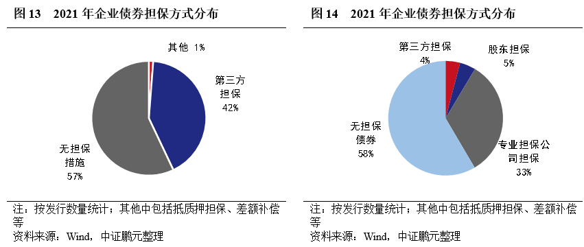 2021年,企業(yè)債有擔保的債券共計231只,數(shù)量占比43%,與上年基本持平。分主體級別看,AA級主體選擇增信發(fā)行的債券比重為82.6%,較上年上升6.1個百分點;AA+級主體選擇增信發(fā)行的債券比重為9.1%,較上年下降2.7個百分點。有擔保債券的擔保方以專業(yè)擔保公司為主,占比33%,較上年上升3個百分點。從趨勢看,2021年7月以來有增信債券占比相對平穩(wěn),11月來有所抬升。