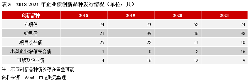 2021年企業(yè)債創(chuàng)新品種合計144只,較上年增加14只,占比29.3%,較上年下降4.3個百分點。第一,發(fā)改委專項債是企業(yè)債市場主要創(chuàng)新品種,在全市場占比約15%。其中,停車場建設(shè)專項債券37只,是專項債主要品種;縣城新型城鎮(zhèn)化建設(shè)專項債券14只,為新增的專項債創(chuàng)新品種;另外,農(nóng)村產(chǎn)業(yè)融合發(fā)展專項債券8只,較往年明顯增長,而地下綜合管廊建設(shè)專項債券本年發(fā)行4只,較往年出現(xiàn)明顯下降。第二,小微企業(yè)增信集合債受政策推動,2021年發(fā)行數(shù)量增長100%。主要由地級市城投公司發(fā)行,2018年來,共有12家地級市城投公司發(fā)行14只小微企業(yè)增信集合債,占比56%。第三,綠色債受政策推動,2018年來呈現(xiàn)增長,2021年數(shù)量有所減少。“碳達峰、碳中和”目標的提出,進一步推動了綠色金融的發(fā)展,2021年綠色債券發(fā)行規(guī)模3720.85億元,較上年增長115%。其中,綠色企業(yè)債發(fā)行38只,較上年下降17%。與其他債券品種的快速增長有關(guān)。