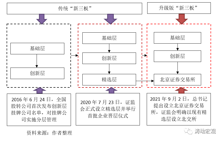 (一)北交所是在現有的新三板精選層基礎上組建,屬于新三板改革的重要內容,即北交所仍可被歸于升級版的“新三板”,具體包括現行的基礎層、創(chuàng)新層以及北交所三個部分。