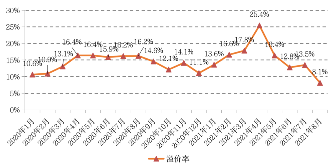 值得注意的是,由于熱點(diǎn)城市在8月紛紛迎來溢價、地價的管控,加之優(yōu)質(zhì)地塊成交占比明顯減少,地市場溢價率較上月大幅下滑,8月環(huán)比減少5.4個百分點(diǎn),降至8.1%,創(chuàng)下2020年以來的最低值。