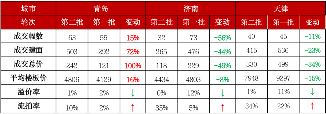 表:青島、濟(jì)南和天津2021年兩次集中土拍熱度對比(萬平方米、億元、元/平方米)