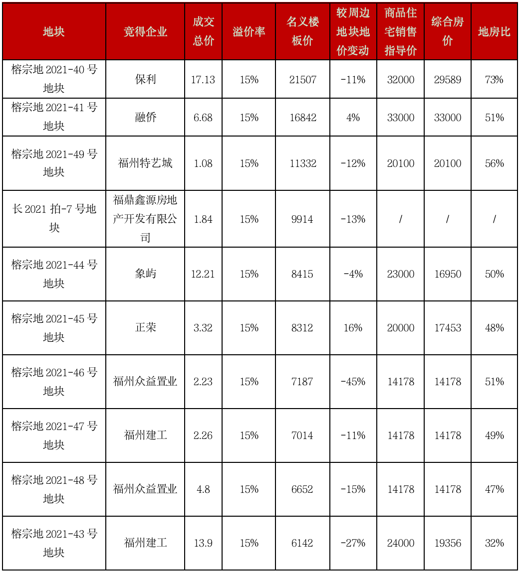 注:由于部分地塊用地性質(zhì)較為復(fù)雜,本表綜合房價和地房比為初步估算。