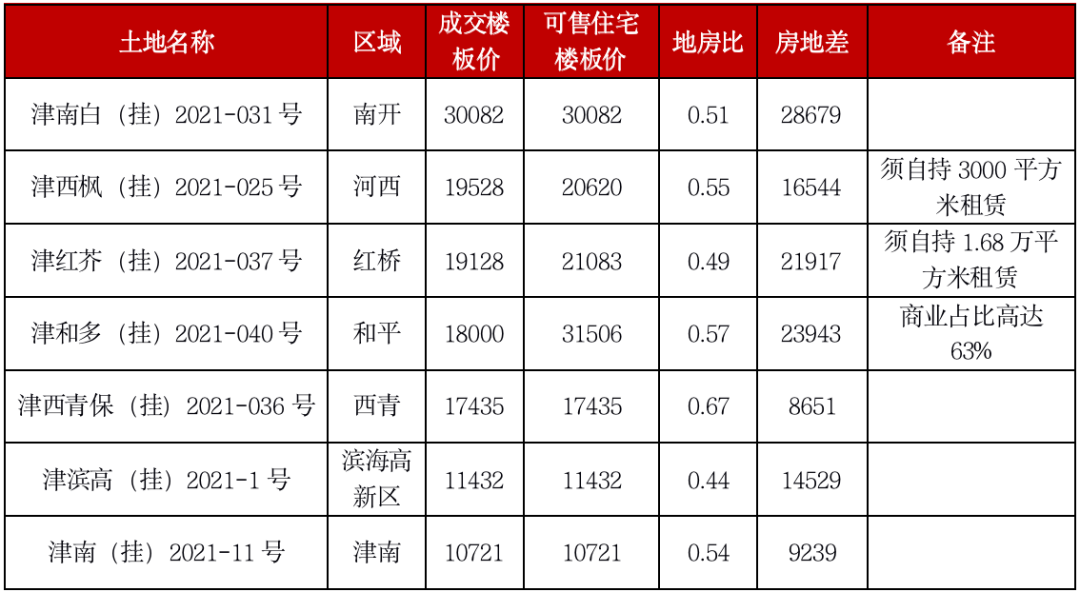 舉個例子,本輪成交樓板價超過1萬元/平方米的高價地中,7宗地,僅有1幅地的地房比超過0.6,其余地塊的地房比都在0.4~0.6之間。包括位于南開中心區(qū)域的南開區(qū)靈隱南里地塊,該地塊創(chuàng)下本輪成交名義地價最高,成交樓板價達(dá)3萬元/平方米,但其周邊多為高端改善住宅項(xiàng)目,平均售價接近6萬元/平方米,因此該項(xiàng)目的地房比僅有0.51,房地差也高達(dá)2.8萬元/平方米,利潤空間十分充足。