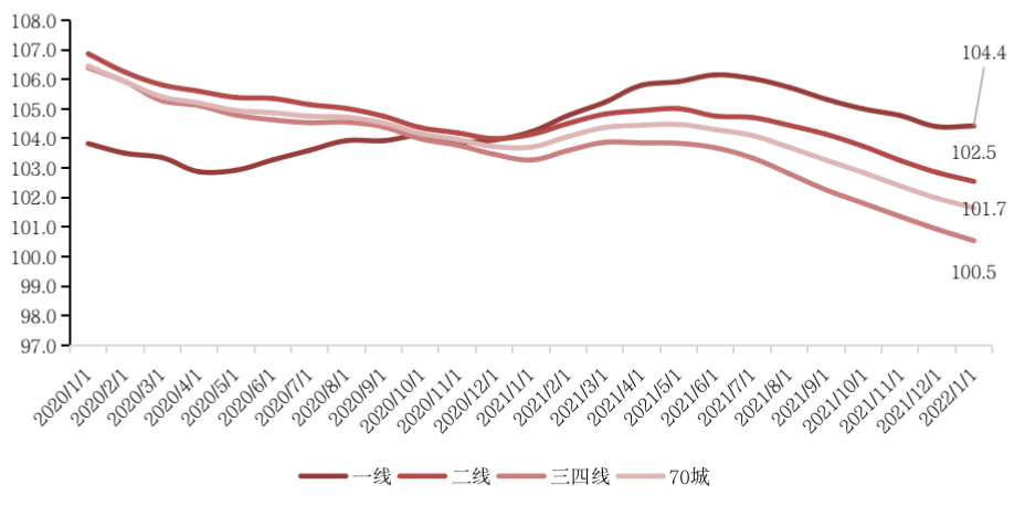 這主要是由于受2021年下半年市場下行影響,至2022年1月三四線城市二手住宅價格仍有0.7%的同比降幅。二手房市場不振下三四線城市購房者不具備充足的購房資金和心理預期投入新房市場。