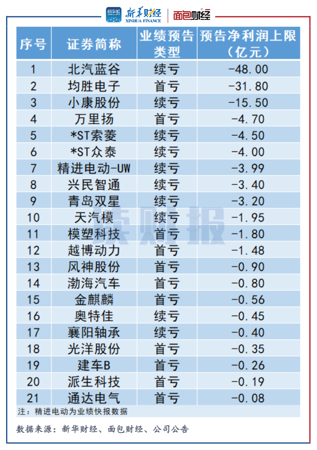 此外,萬里揚(yáng)、*ST索菱虧損上限在4億元以上,精進(jìn)電動(dòng)、興民智通、青島雙星虧損上限均達(dá)3億元以上。