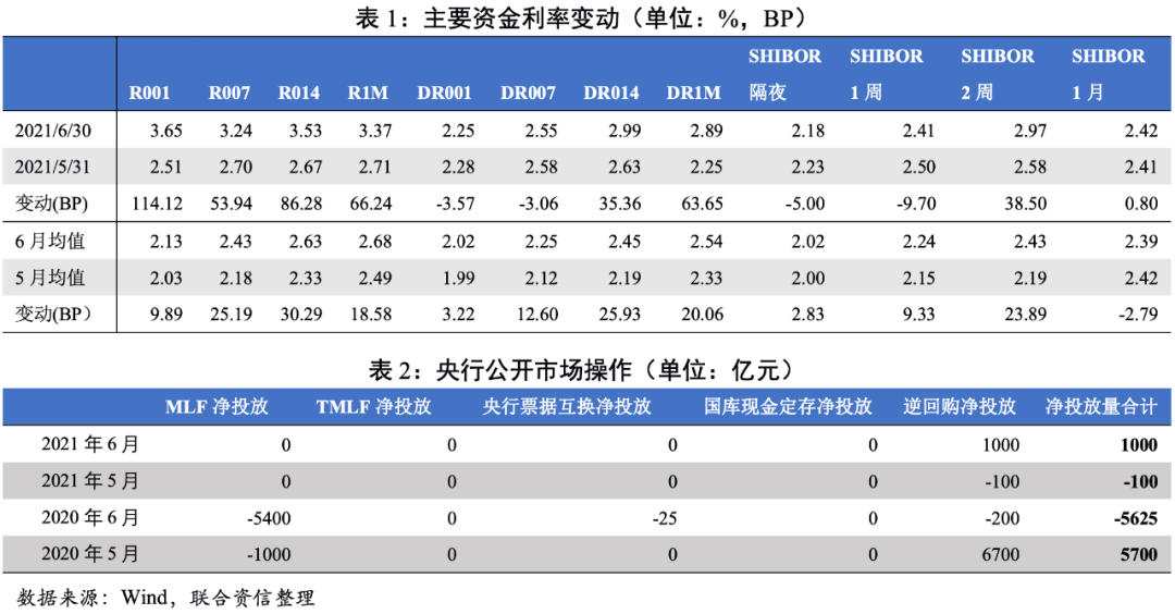 端午節后,跨季資金緊張,跨月資金利率上漲顯著,央行加大投放量以維持資金面平穩。季末資金面較為緊張,尤其是端午節后,各期限資金利率全線上行,銀行間7天回購利率(R007)一度超過7天常備借貸便利利率(SLF)。季末央行維護資金面意圖明顯,加大公開市場投放量,以維持跨季資金面穩定。整體看,6月央行公開市場凈投放總量為1000億元,較5月(凈回籠100億)明顯增加。