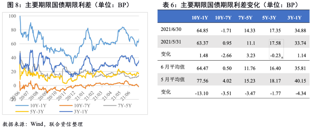 期限利差大多收窄。從期限利差來看,國債10Y-1Y及3Y-1Y期限利差波動較大,都呈現上半月期限利差收窄、下半月期限利差走闊的軌跡。國開債除10Y-1Y期限利差波動較小外,其余期限利差均經歷了較大的波動。整體看,6月主要期限國債和國開債期限利差均值大多較5月收窄,收益曲線趨向平坦化。
