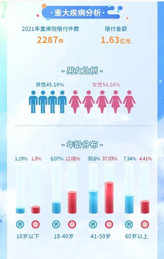 從性別分布來看,男女比例分別為45.16%和54.84%,女性因重大疾病理賠的比例比男性高出9.68個百分點。