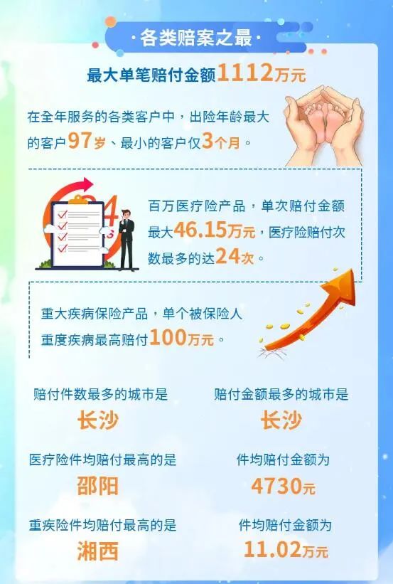 從該公司各類賠案情況看,最大單筆賠付金額1112萬元;在全年服務的各類客戶中,出險年齡最大的客戶97歲、最小的客戶僅3個月;百萬醫療險產品,單次賠付金額最大46.15萬元,醫療險賠付次數最多的達24次;重大疾病保險產品,單個被保險人重度疾病最高賠付 100萬元;