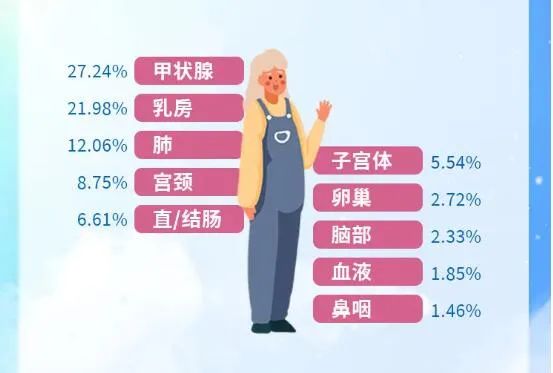 從男性和女性患惡性腫瘤的部位看,甲狀腺癌已成為成年人群體占比排名“數一數二”的惡性病。在未成年人重疾賠付原因中,白血病以26.79%的比例高居榜首。