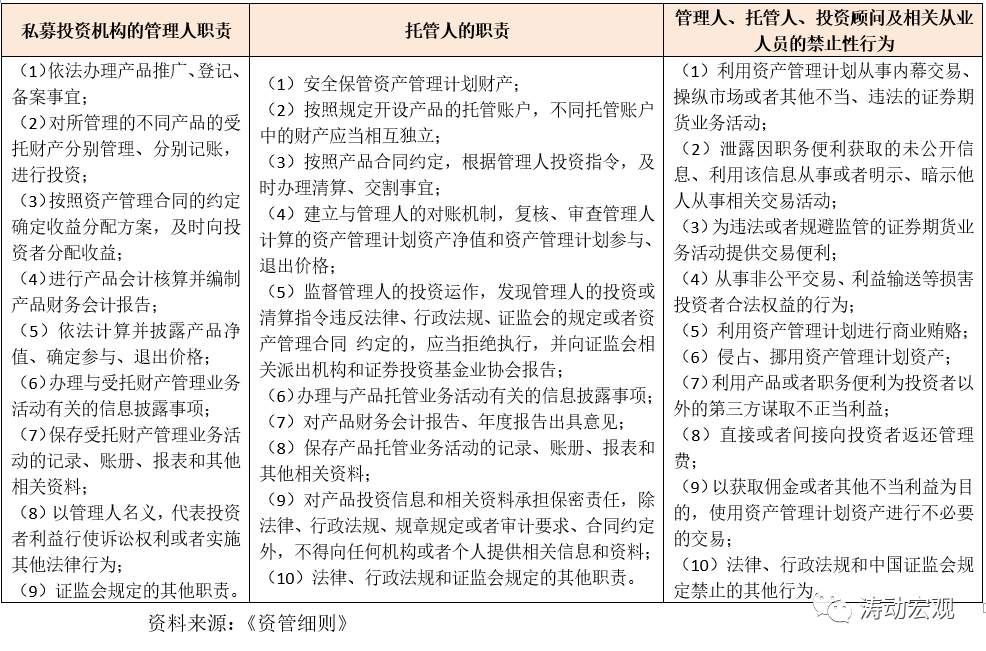 此外《資管細(xì)則》還對管理人、托管人的職責(zé)以及相關(guān)禁止行為進(jìn)行了明確。