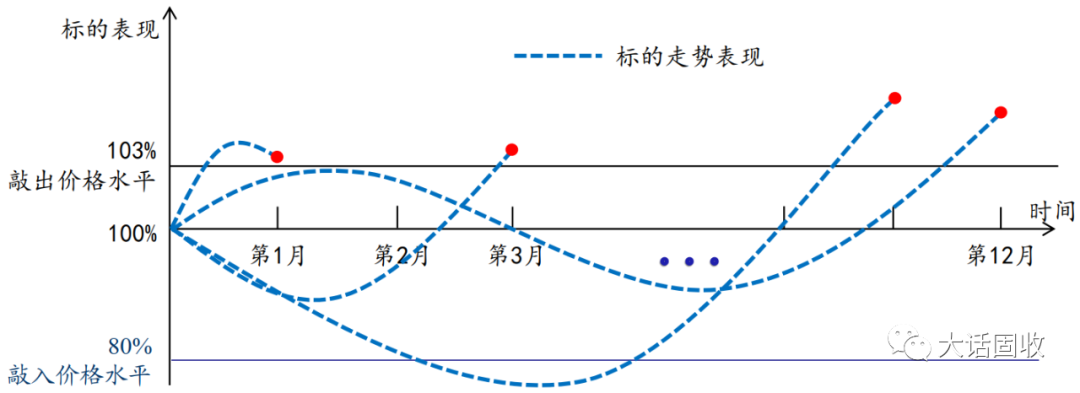 如果存續期內標的指數跌破了期初價格80%,到期的時候又回到了期初價格之上,但是沒有觸碰103%的上軌,那么投資者拿回自己的本金。