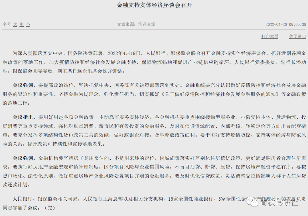 二、沒有降息的一天也有大事發(fā)生。2022年4月20日,央行官網(wǎng)刊發(fā)一則新聞,2022年4月19日央行與銀保監(jiān)會召開金融支持實(shí)體經(jīng)濟(jì)座談會,雖然全文只有700余字,但釋放的信息是有一定價值的。具體如下,