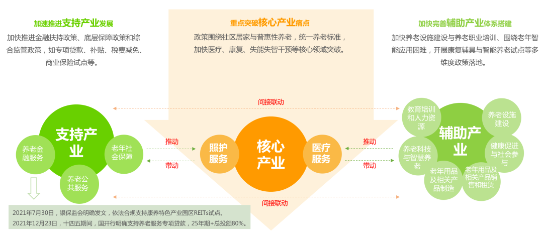 2021年國家全面啟動養老產業化、體系化政策發布,重點圍繞核心產業、支持產業、輔助產業的深化改革與產業培育,啟動各細分領域產業扶持政策與產業試點。進入2022年,在目標政策導向下,各地方將加快推動各產業細分領域的政策扶持與落地實施。