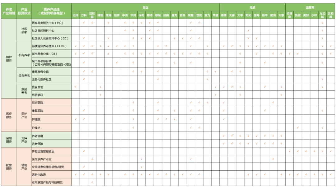 其中,七大投資模式指社區居家養老、機構養老、綜合養老、旅居養老、醫護產業、支持產業和輔助產業。如房企聚集“照護+醫療+產業配套”三大類型,險資企業聚集“保險+醫養服務”兩大業態,運營商重點圍繞養老運營管理輸出等。