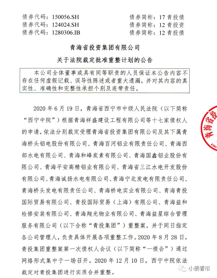 12月27日,青海省投資集團有限公司(以下簡稱:“青海省投”)公告稱,法院已裁定批準《青海省投資集團有限公司等十七家企業重整計劃》,公司進入重整計劃執行期間。