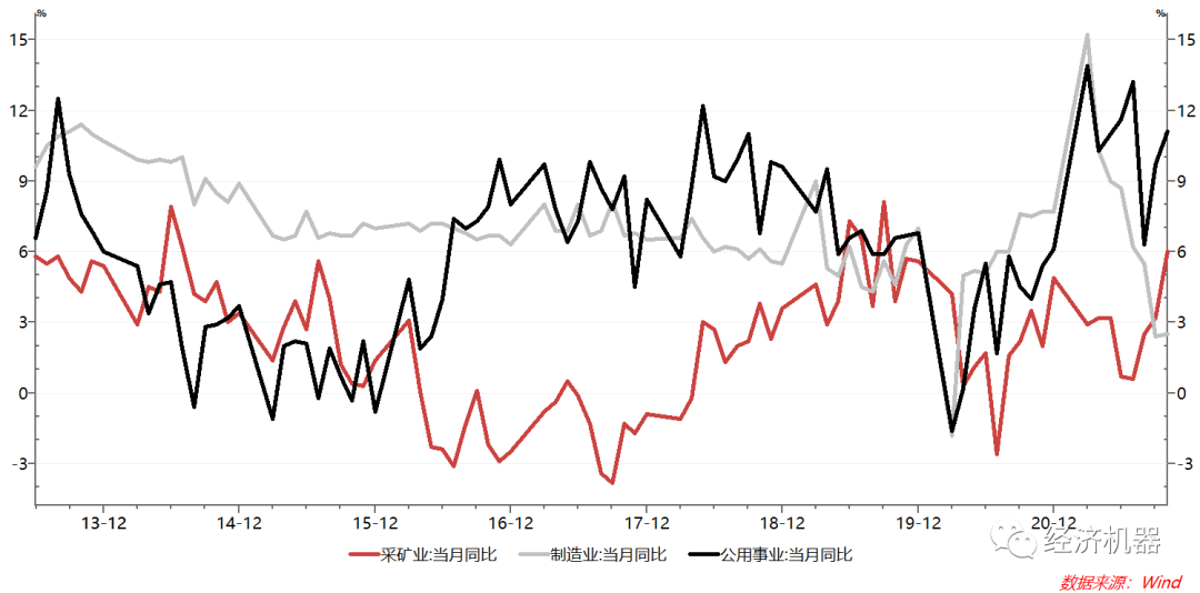 1)保供下,電力公用事業景氣提高,助推工業增加值增速企穩回升。10月份工業增加值當月同比增長3.5%,自上月的3.1%的低點回升,也好于市場3.2%的預期。分項來看,制造業增加值增長2.5%,和上月增速基本持平;采礦業增加值同比增長6%,較上月加速2.8pct;電力等公用事業同比增長11.0%,較上月加速1.4pct。在能源保供下,煤炭等采礦業和電力等公用事業部門開足馬力生產,對于工業增加值的企穩回升起到了關鍵支撐作用。中下游制造業則受“限電”等影響,幾乎沒有改善。中下游多