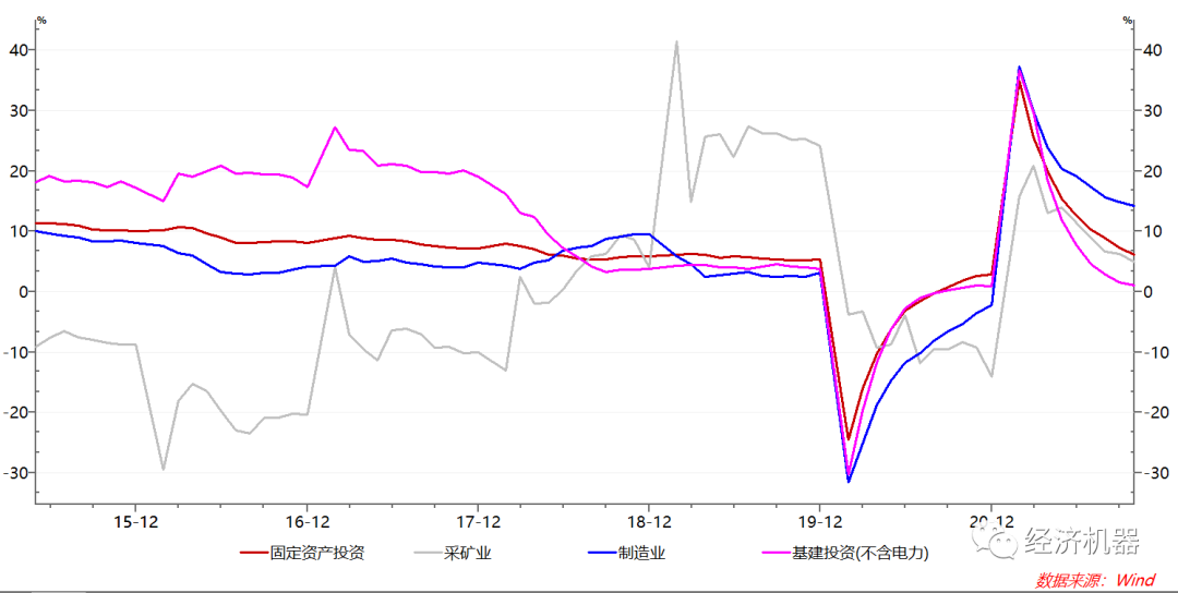 3)固定資產投資增速進一步回落。10月份,固定資產投資累計同比增長6.1%,增速較上月回落1.2pct,已經是連續8個月回落。分項看,制造業投資增速小幅回落至14.2%,采礦業投資增速回落1.2pct至5%。基建投資增速則進一步回落至1%(圖5)。在高景氣下,采礦業投資增速仍然疲弱,表明供應端和企業對未來需求的信心方面存在分歧;基建投資疲弱,顯示地產下行下,財政困難制約了“積極財政政策”的空間。