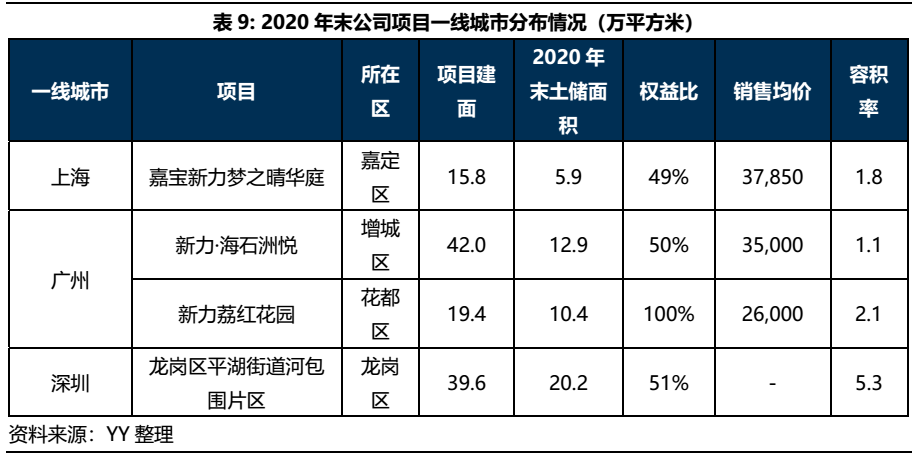 聚焦二三線,同時下沉部分四線。按城市能級看,公司進入的一線城市僅有廣州(23.3萬平方米,占比1.5%)、深圳(20.2萬平方米,占比1.3%)和上海(5.9萬平方米,占比0.4%),各自僅有1-2個項目,且全部位于非中心城區。考慮到2020年度公司在一線城市并無新增拿地,公司可能尚無深入一線城市的打算,一線城市項目用來提高知名度的意義更大。