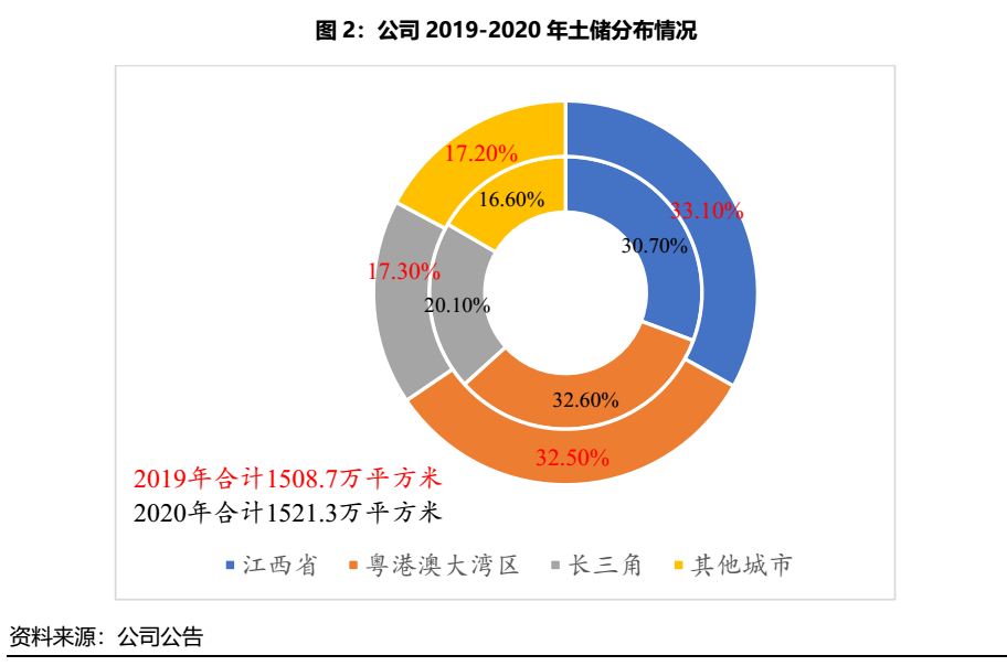 這一戰略布局在公司經營中體現較為明顯。公司一改2018-2019年度對外攻城略地的表現,2020年新進入城市僅4座;公司2020年度拿地情況較上年變化明顯,整體看,對江西省下沉更加顯著,江西省內南昌以外地區占比增加,而對粵港澳、其他地區風險偏好較低,主要集中于較早進入深耕的惠州以及其他省會城市,江西省、長三角、粵港澳以外的地區占比下降明顯。從拿地均價上看,2020年拿地整體相比2019年較為下沉。