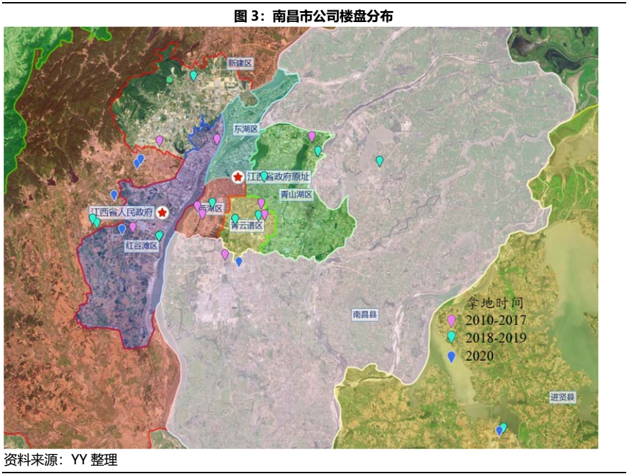 而從樓盤分布情況上看,公司的項目分布整體處于贛江兩岸,且也在向西發展。截至2020年末,公司項目主要分布在中心城區以及中心城區外圍地區,其中老城區的項目拿地時間均在2020年之前,公司2020年拿地主要集中在新城區,為新建區與紅谷灘區交界一帶,南昌市遠郊的進賢縣也有零星的項目。