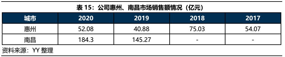 綜合來看,公司在惠州的項目主要分布在臨深片區、主城區以及工業區,與南昌市相比需求來源更為復雜,且去化速度較弱。好的方面是公司項目所在區的房地產市場相對景氣,且隨著深圳房地產調控趨嚴、14號地鐵線惠州段等利好落地,深圳外溢需求或將更為明顯。