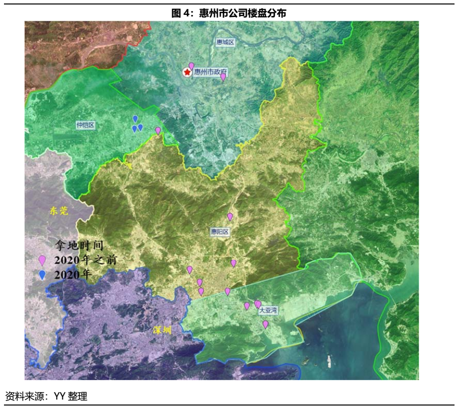 從空間上看,公司在惠州的項目主要分布在承接深圳外溢剛需的臨深片區,小部分在承接產業支撐的仲愷區以及主城區惠城區。從時間上看,2019年之前公司十分熱衷于在鄰近深圳的區域拿地,2019年公司未在惠州拿地,而2020年公司轉了個大彎,拿地均在仲愷區,且位置較為集中,相互之間距離較為接近。仲愷區是惠州的產業園區,入駐企業較多,距離深圳較遠,公司應是看中了這里的產業支撐。然而公司在仲愷區的地塊過于集中,且總建筑面積達120萬平方米,后續去化可能存在一定壓力。