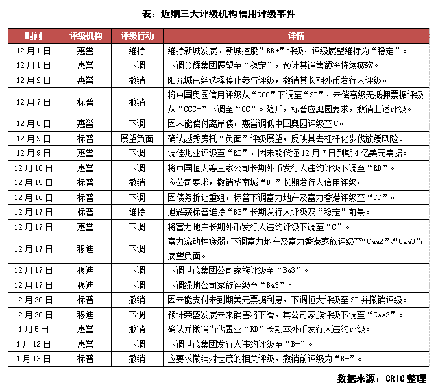 從三大評級機構的態度來看,未來2022年房企的境內外融資環境依然嚴峻。據不完全統計,自2021年12月至2022年1月14日,三大評級機構信用評級依舊以下調為主,下調事件共出現11起,撤銷評級事件6起,多針對已暴雷或發生違約的房企;僅有少部分房企獲得評級的維持,評級上調未有出現。
