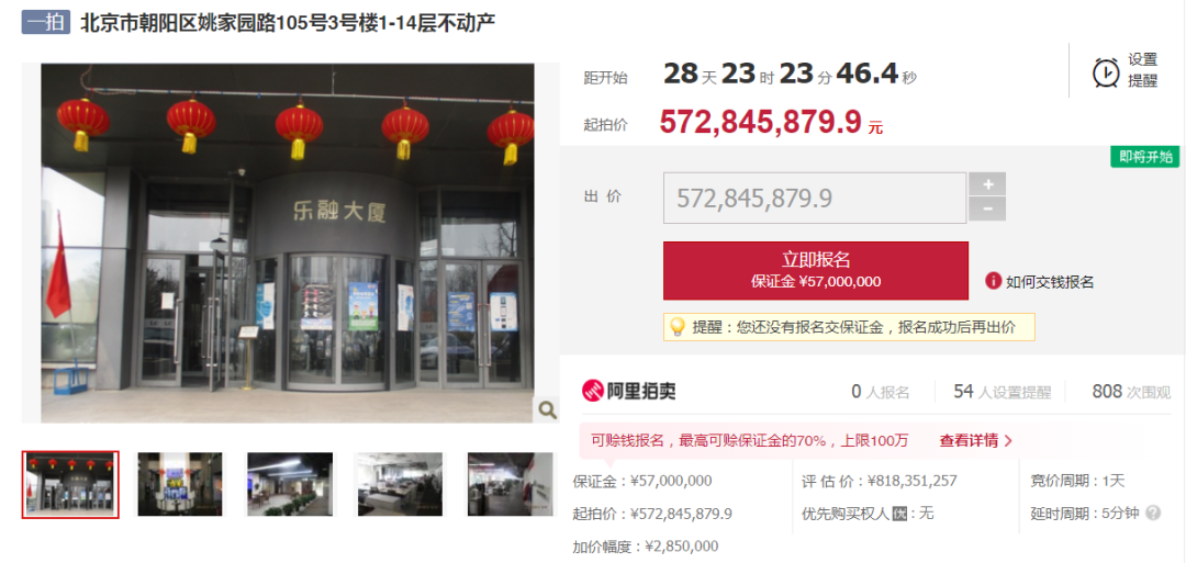 8月10日,阿里拍賣網(wǎng)顯示,北京市朝陽(yáng)區(qū)姚家園路105號(hào)3號(hào)樓1-14層不動(dòng)產(chǎn),即樂(lè)融大廈(此前名為樂(lè)視大廈),將于9月9日拍賣,起拍價(jià)5.73億元。