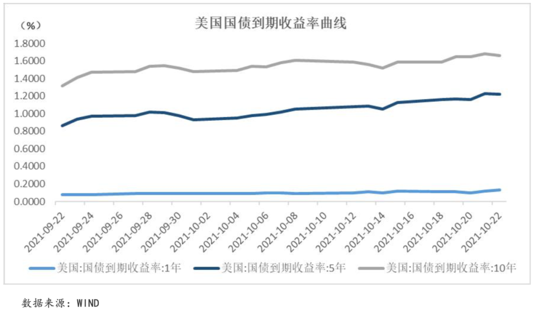 本周,美國(guó)公布數(shù)據(jù)顯示美國(guó)高通脹仍將持續(xù)運(yùn)行,各期限美債收益率紛紛上漲。具體來(lái)看,本周1年期、5年期和10年期美國(guó)國(guó)債平均收益率較上周上漲0.65個(gè)BP、10.05個(gè)BP和8.10個(gè)BP至0.11%、1.19%和1.65%。