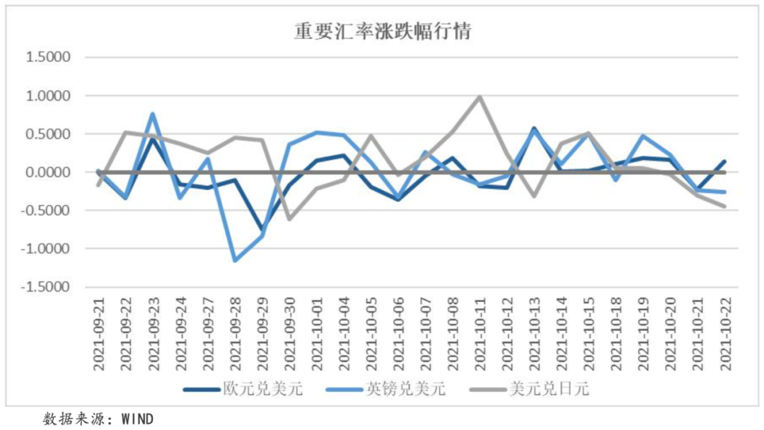 本周,在高通脹壓力以及美元受到打壓的背景下,歐元暫時(shí)保持升勢(shì)。本周歐元兌美元收于1.1642,周內(nèi)累計(jì)收漲0.34%。英國(guó)10月綜合PMI數(shù)據(jù)繼續(xù)上行,達(dá)到5月以來(lái)的最高位,企業(yè)復(fù)蘇勢(shì)頭強(qiáng)勁,支撐英鎊表現(xiàn)。本周英鎊兌美元收于1.3758,周內(nèi)累計(jì)收漲0.03%。本周,美元兌日元收于113.5000,周內(nèi)累計(jì)收跌0.66%。