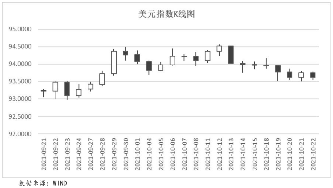 本周,美元指數(shù)出現(xiàn)下跌。一方面,美國(guó)“褐皮書(shū)”顯示經(jīng)濟(jì)增速已呈現(xiàn)放緩的狀態(tài),打壓美元走勢(shì);另一方面,隨著美國(guó)PMI制造業(yè)數(shù)據(jù)的釋出顯示美國(guó)勞動(dòng)力和供應(yīng)鏈的問(wèn)題仍將繼續(xù)限制制造業(yè)的恢復(fù),市場(chǎng)對(duì)美國(guó)經(jīng)濟(jì)的復(fù)蘇預(yù)期受到打壓。截至本周五,美元指數(shù)收于93.6116,周內(nèi)累計(jì)收跌0.38%。