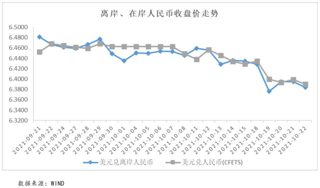 本周,中國(guó)三季度GDP增幅同比達(dá)4.9%,經(jīng)濟(jì)復(fù)蘇持續(xù)穩(wěn)定向好;而美國(guó)通脹問(wèn)題持續(xù),經(jīng)濟(jì)恢復(fù)不確定性增加。因此,在岸和離岸人民幣匯率均呈現(xiàn)波動(dòng)走強(qiáng)態(tài)勢(shì)。截至周五,美元兌離岸人民幣匯率收于6.3839,周內(nèi)小幅下跌0.79%;美元兌在岸人民幣匯率收于6.3903,周內(nèi)累計(jì)收跌0.66%。