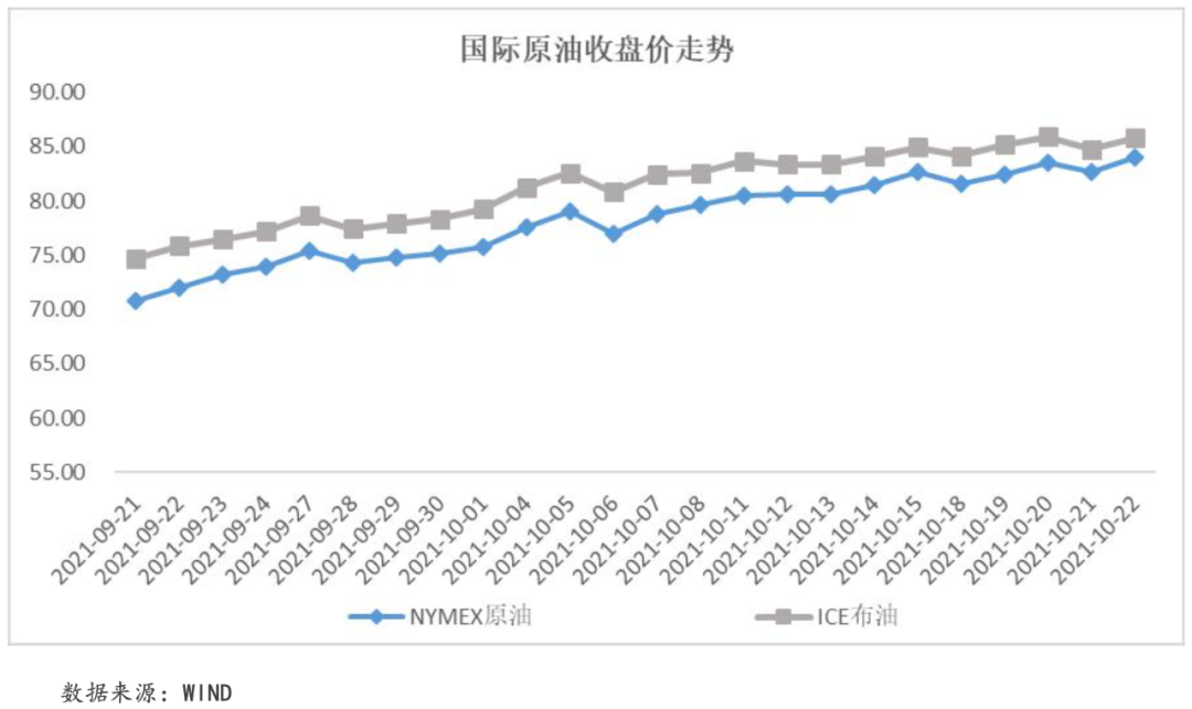 本周,國(guó)際油價(jià)繼續(xù)周內(nèi)全面上漲。一是隨著全球經(jīng)濟(jì)復(fù)蘇步伐的加快,石油需求顯著上升,如10月美國(guó)和歐元區(qū)PMI制造業(yè)和服務(wù)業(yè)活動(dòng)指數(shù)仍然高于50,經(jīng)濟(jì)活動(dòng)仍在擴(kuò)張;二是隨著亞洲市場(chǎng)對(duì)石油需求的上升(韓國(guó)11月原油購(gòu)買(mǎi)量創(chuàng)下歷史最高水平),當(dāng)下的石油供給結(jié)構(gòu)將進(jìn)一步緊張。三是各國(guó)能源儲(chǔ)備逐漸下降的基礎(chǔ)上,OPEC+仍保持原計(jì)劃產(chǎn)出,供應(yīng)趨緊。總體來(lái)看,在供應(yīng)不足的條件下,強(qiáng)勁的需求拉動(dòng)石油價(jià)格上揚(yáng)。截至本周五收盤(pán),NYMEX原油價(jià)格收于83.98美元/桶,周內(nèi)累計(jì)收漲2.41%;ICE布油價(jià)格收于85.77美元/桶,周內(nèi)累計(jì)收漲0.97%。