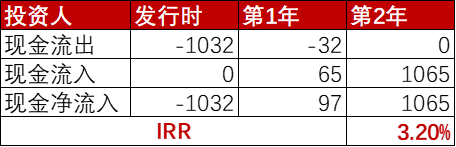 現(xiàn)金流出前置,使得投資人獲得的IRR是要低于用標(biāo)的債券的票面利率-憑證設(shè)立價(jià)格的,投資人的現(xiàn)金流入下圖所示,最終算的的IRR是3.2%,要低于前面計(jì)算的3.3%。