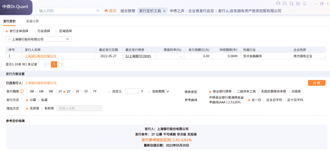 根據(jù)中債Dr Quant的計(jì)算結(jié)果,上海銀行發(fā)行2年期同期限債券的票面利率區(qū)間只有2.41%~2.61%,遠(yuǎn)不如買(mǎi)新城控股的債+上海銀行設(shè)立的CRMW,如果我是個(gè)理性投資人,肯定是選擇后者。