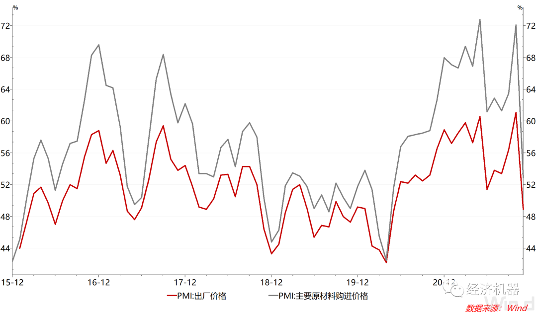 3)工業生產領域價格顯著下降。11月,PMI主要原材料購進價格指數和出廠價格指數分別為52.9%和48.9%,較上月顯著下降,分別回落19.2和12.2個百分點(圖4)。