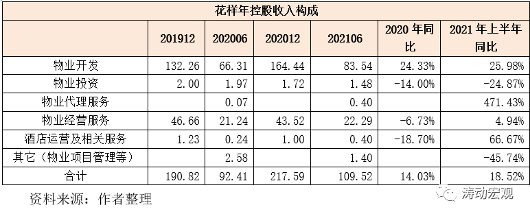 1、從花樣年控股的收入構成來看,物業開發與物業經營是兩大主要來源,二者合計貢獻了花樣年控股收入的95%以上,其中物業開發貢獻比例超過3/4,這意味著花樣年控股的收入來源仍主要依賴于地產開發,酒店運營貢獻較少。