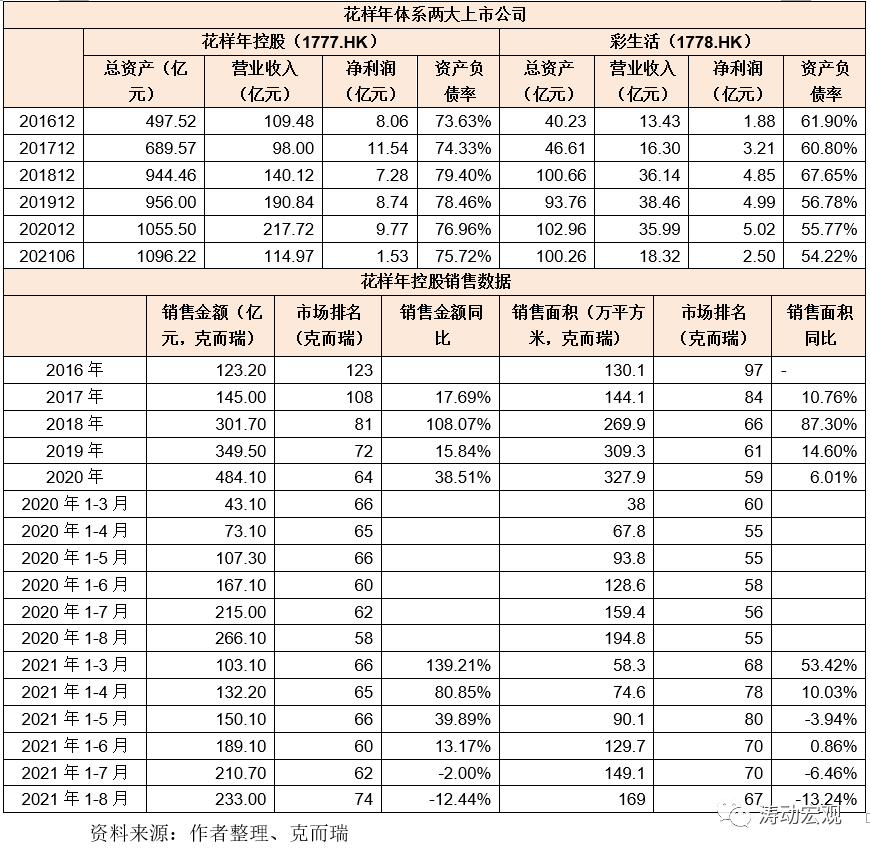 截至今年上半年,花樣年體系的兩大上市公司(即花樣年控股和彩生活)的總資產分別為1096.22億元和100.26億元,分別實現營收114.97億元和18.32億元(同比分別增長22.99%和1.14%)、凈利潤分別為1.53億元和2.50億元(同比分別增長58.73%和5.80%)。從規模上看,花樣年并不突出,在百強地產企業中排名大約在50名以外。