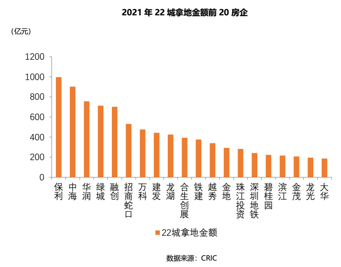 從22城拿地金額情況看,保利、中海、華潤拿地金額排名前三位,三家均為央企。拿地最多的10家房企中,7家為國企央企,3家為民企;拿地最多的20家房企中,11家是國企央企,9家是民企,國企央企占據(jù)較大優(yōu)勢。