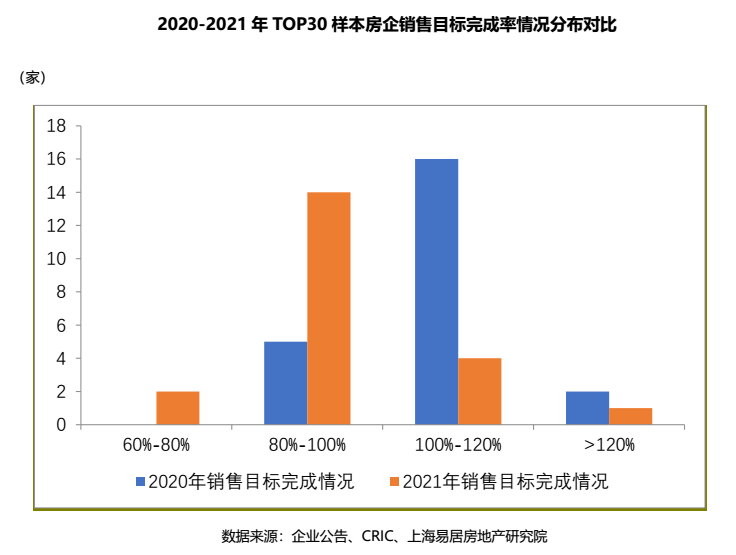 再放到TOP30樣本房企,目標(biāo)完成率平均值為96%,較上年下降13個百分點(diǎn);約8成的房企銷售未達(dá)標(biāo),僅5家房企完成了銷售任務(wù)。