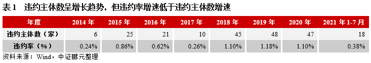 2014-2021年(2021年數據截至7月底,下同),我國信用債券違約主體數不斷增長,2019年為違約高峰,首次違約的主體數達到48家(表1)。隨著違約主體數增加,違約率也有所上升,但由于我國信用債券市場擴容、發債主體數大幅增長(圖1),違約率增長速度低于違約主體數的增長速度,近三年基本維持在1.1%上下。在2017年時,違約數量大幅下降,違約率下降至2014年后的歷史低點0.26%(表1和圖1),隨后違約數量大幅增加,違約率開始反彈,并創新高隨后維持較高水平。2021年由于時間跨度只有7個月,違約數量較少,導致違約率較低。